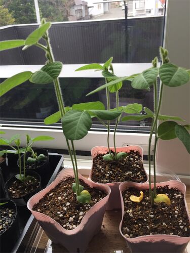 『こどもピーマン』発芽せず 一週間くらい前に播種したのですが、発芽しないので別の作戦でいくことにしました。キッチンペーパーに水を含ませて発芽(発根?)してから植える事にしました。 サニーレタス 少しだけ大きくなりました。 枝豆 断根・摘心して植…